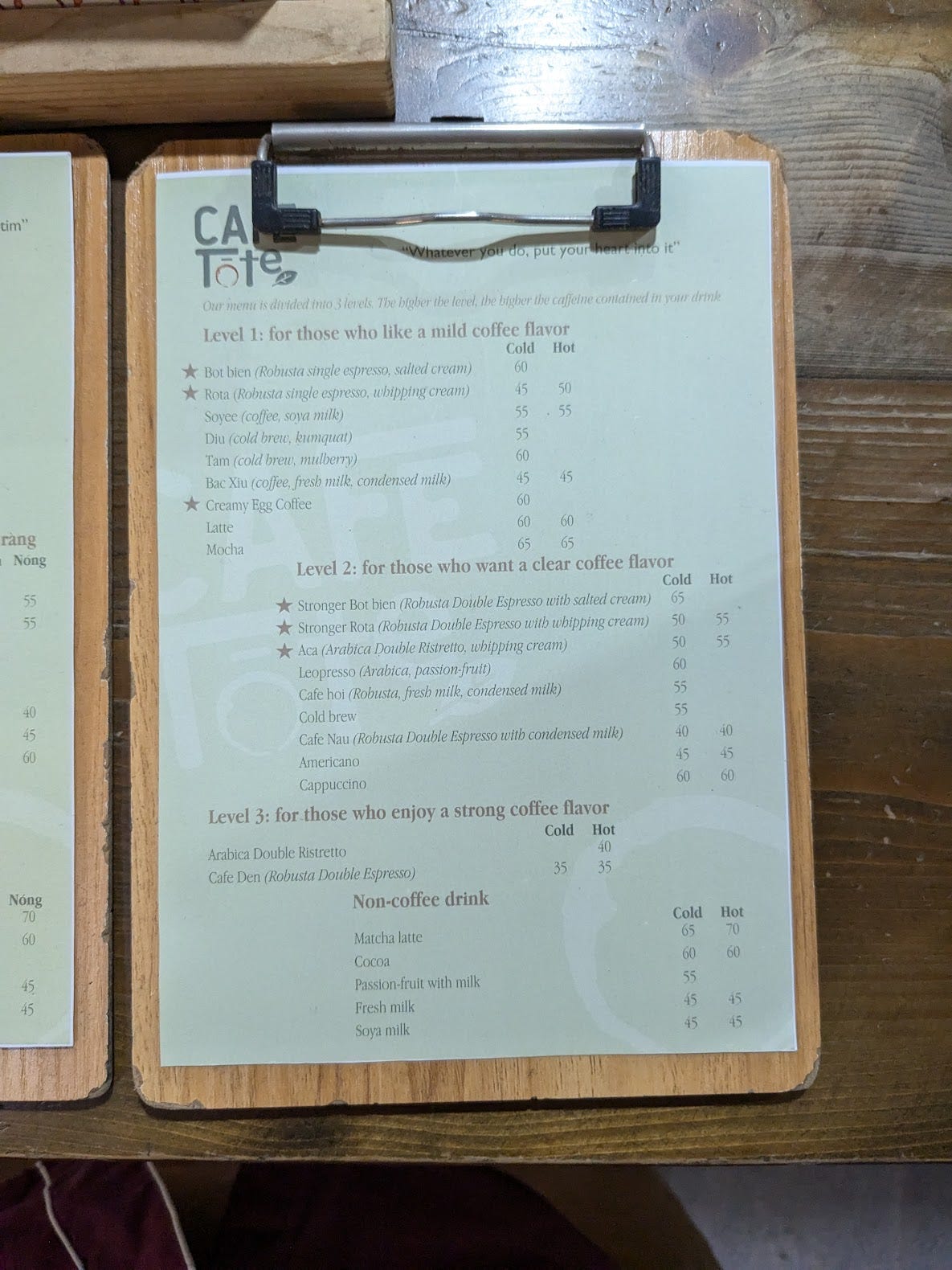 Cafe Tòte has two locations, but I much prefer the one on Vạn Phúc for how spacious it is compared to the Hoàn Kiếm one. The menu is so kind and gentle. It’s divided into three sections (levels) for what type of coffee people like – coffee beginners, coffee flavor lovers, and lovers of bitter, strong coffee. This type of gentle hand-holding on a menu for a specialty coffee place is so wonderful, because specialty coffee can be so intimidating if you don’t drink it a lot.